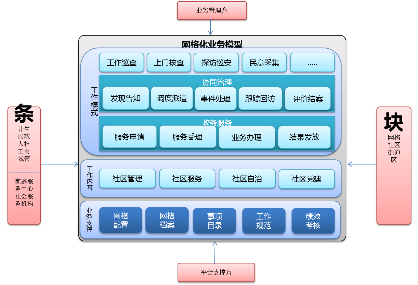 網(wǎng)格化管理系統(tǒng),定位為支撐政府圍繞 “兩人一地”核心管理服務(wù)對象,基于GIS、數(shù)據(jù)共享交換而進(jìn)行的服務(wù)、事件、管理等社會治理工作的平臺型產(chǎn)品。