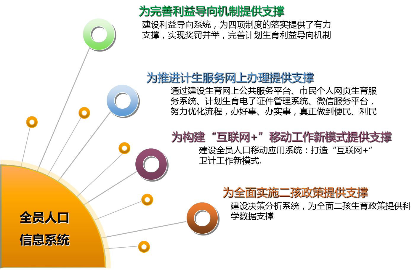 全員人口信息系統(tǒng)支撐完善利益導(dǎo)向機(jī)制,為政府構(gòu)建支撐群眾按政策生育的制度環(huán)境;推進(jìn)計(jì)劃生育網(wǎng)上辦事服務(wù),真正實(shí)現(xiàn)老百姓辦證“少跑、快辦”;構(gòu)建“互聯(lián)網(wǎng)+”移動(dòng)工作新模式,為衛(wèi)計(jì)工作人員提供移動(dòng)辦公環(huán)境,提高辦公效率;構(gòu)建人口決策分析系統(tǒng),支撐全面實(shí)施二孩政策。