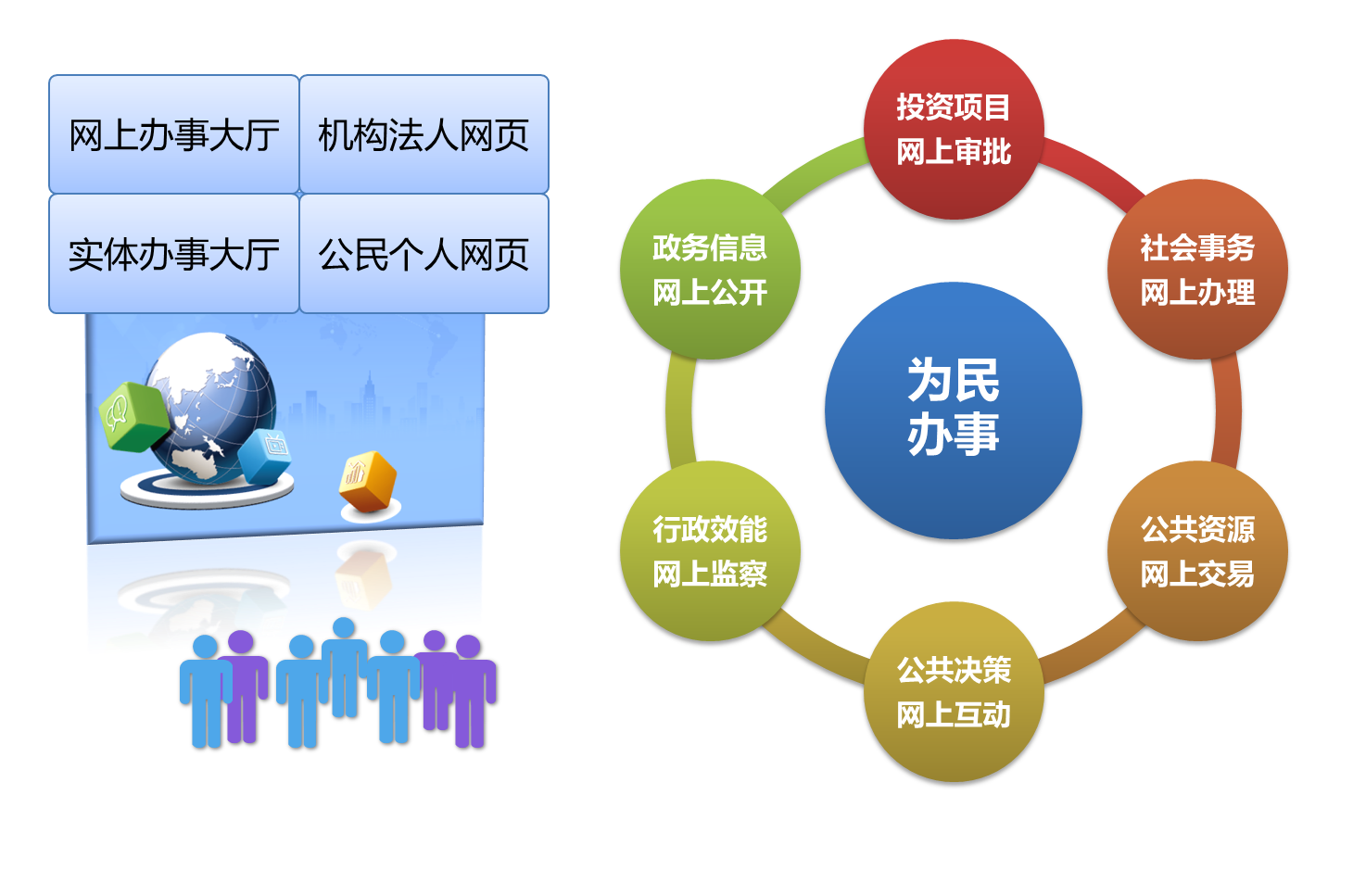 網(wǎng)上辦事大廳集“政務(wù)信息網(wǎng)上公開、投資項(xiàng)目網(wǎng)上審批、社會(huì)事務(wù)網(wǎng)上辦理、公共資源網(wǎng)上交易、公共決策網(wǎng)上互動(dòng)、行政效能網(wǎng)上監(jiān)察”于一體,橫向到行政部門、縱向到鄉(xiāng)鎮(zhèn)(街道),推動(dòng)行政審批和社會(huì)服務(wù)事項(xiàng)由到部門實(shí)地辦理向網(wǎng)上辦理轉(zhuǎn)變。企業(yè)專屬網(wǎng)頁(yè)、市民個(gè)人網(wǎng)頁(yè)為企業(yè)和群眾提供專屬的、便捷化、個(gè)性化的電子政務(wù)和便民服務(wù),實(shí)現(xiàn)從“人找信息”到“信息找人”,支撐網(wǎng)上辦事 “少走”和“快辦”。