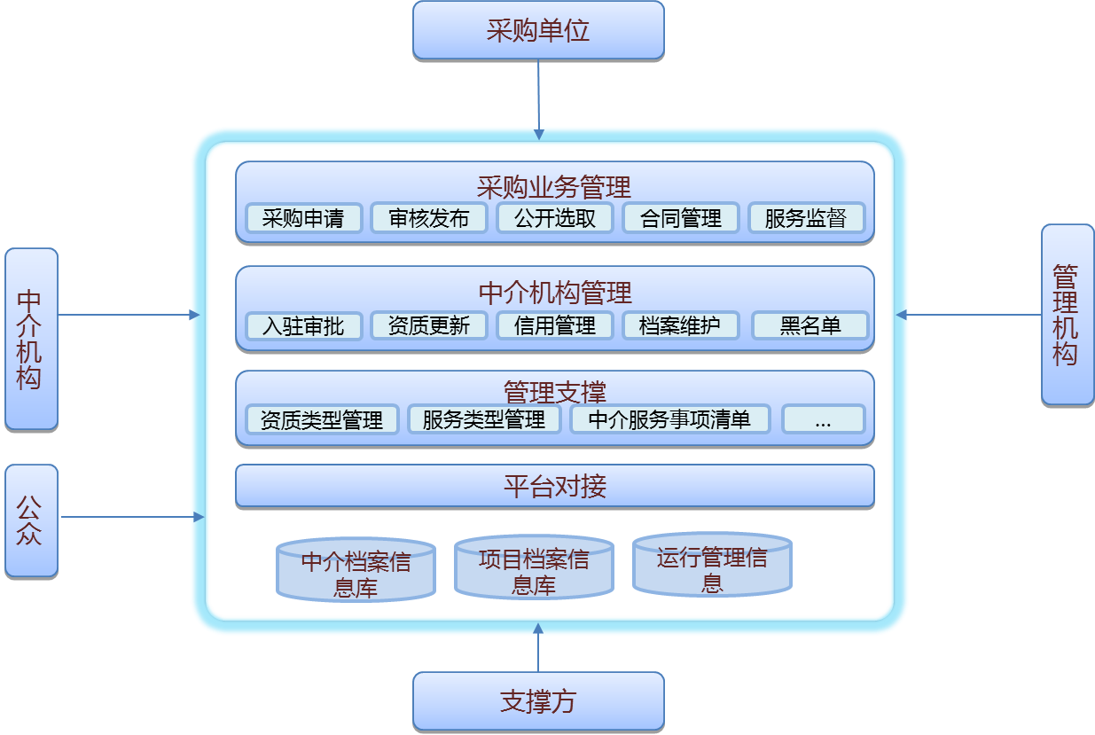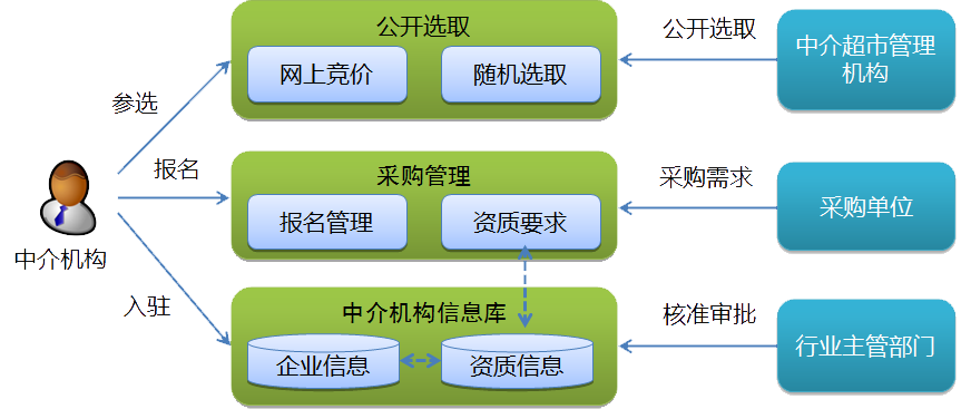 為使用財政資金的項目提供中介推介服務、中介機構分類入駐駐管理、中介生命周期信息管理、中介資質信息管理、部門購買服務邀標公告、中介機構應邀報名、搖號開標、合同管理、時限管理、滿意度評價等服務的一個交易平臺和監(jiān)管平臺。政府投資項目可以有針對性挑選中介機構,可以從中擇優(yōu)選取,壓縮了權力尋租空間,提高了效率。企業(yè)也可以很方便地通過超市“一站式”自主選取挑選中介服務。